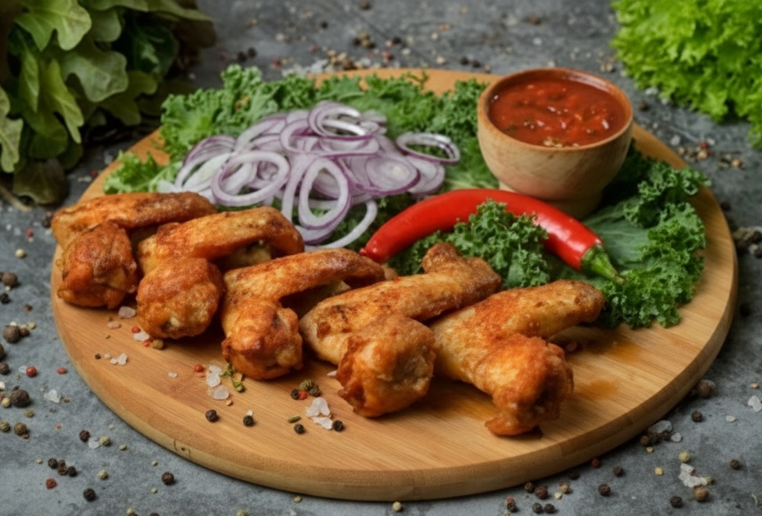 Зажигательные лучи солнца ласково касаются ярких и аппетитных куриных крылышек, лишь недавно покинувших горячий мангал. Взгляд сверху открывает полную картину каждого мельчайшего штриха — светло-золотистые полоски, оставленные горячим железом, изящно покрывают темно-красное мясо, создавая гармонию цветов и форм.