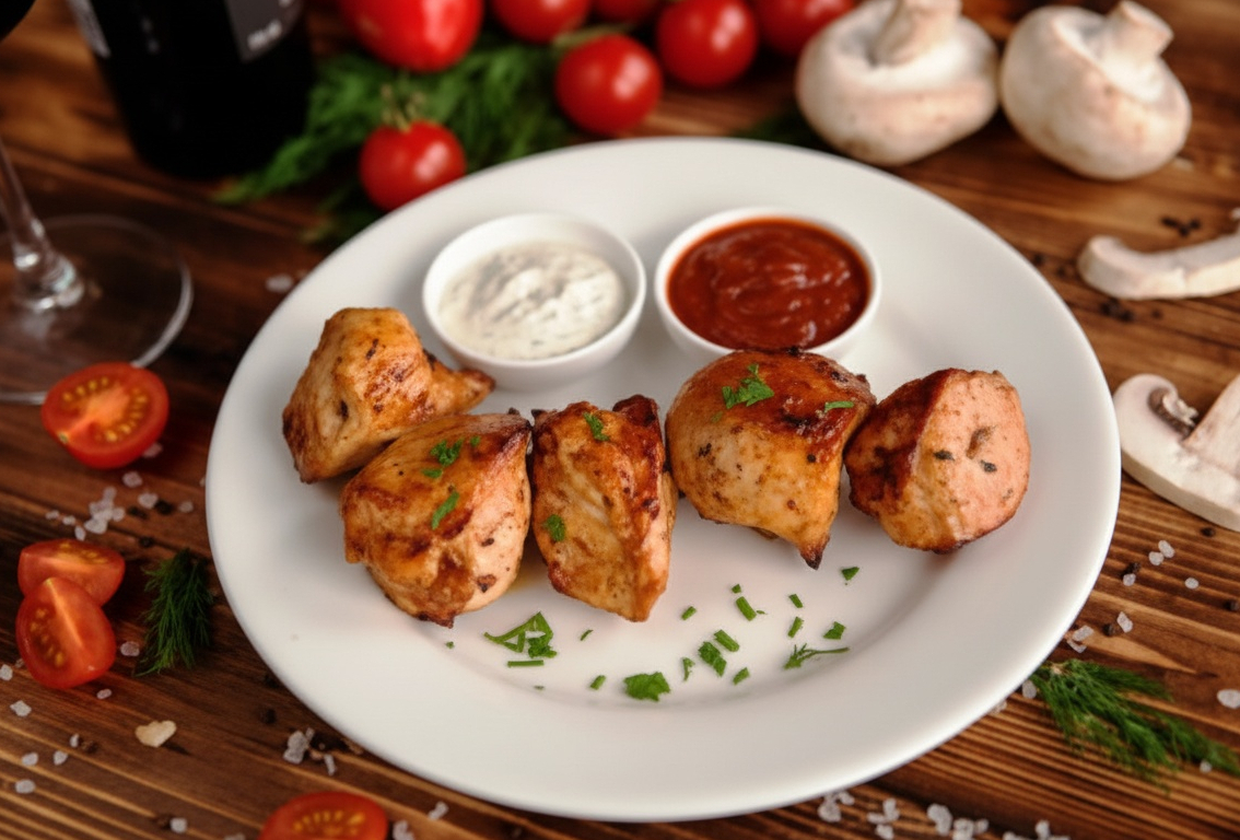 Восхитительная куриная грудка, мастерски приготовленная на мангале, завораживает взор своим природным сиянием и яркими цветами. Курица покрыта тонкой хрустящей корочкой, сохранившая свою сочность и натуральный вкус.