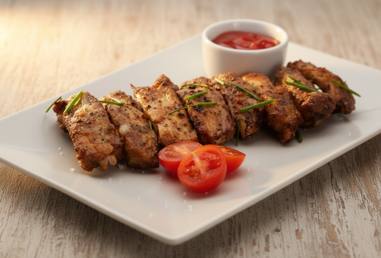 Представляем вашему вниманию великолепное блюдо, олицетворяющее летний отдых и домашний комфорт — свиные ребрышки, приготовленные на мангале. Сочные, ароматные куски мяса покрыты легкой золотистой корочкой, образовавшейся под воздействием горячего пламени. Тонкие следы от гриля украшают каждый кусочек, придавая изделию оригинальность и уникальность.