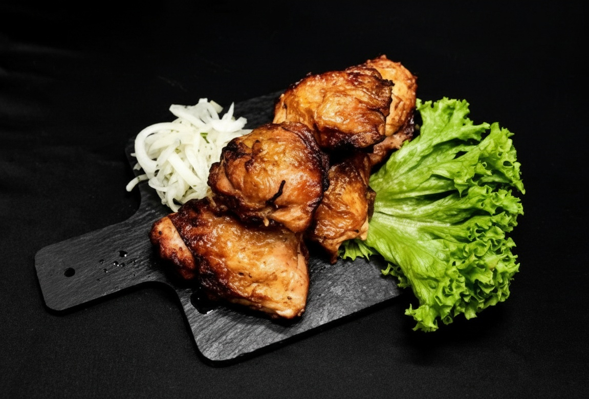 Представляю вашему вниманию подлинное воплощение домашнего комфорта и тепла — куриную голень, жаренную на мангале. Нежнейшее мясо, обработанное умеренным жаром угля, приобрело красивую золотистую корочку, сохранив сочность и естественный аромат. Каждая порция сохраняет следы решётки гриля, подчёркивая уникальный характер приготовления на живом огне.