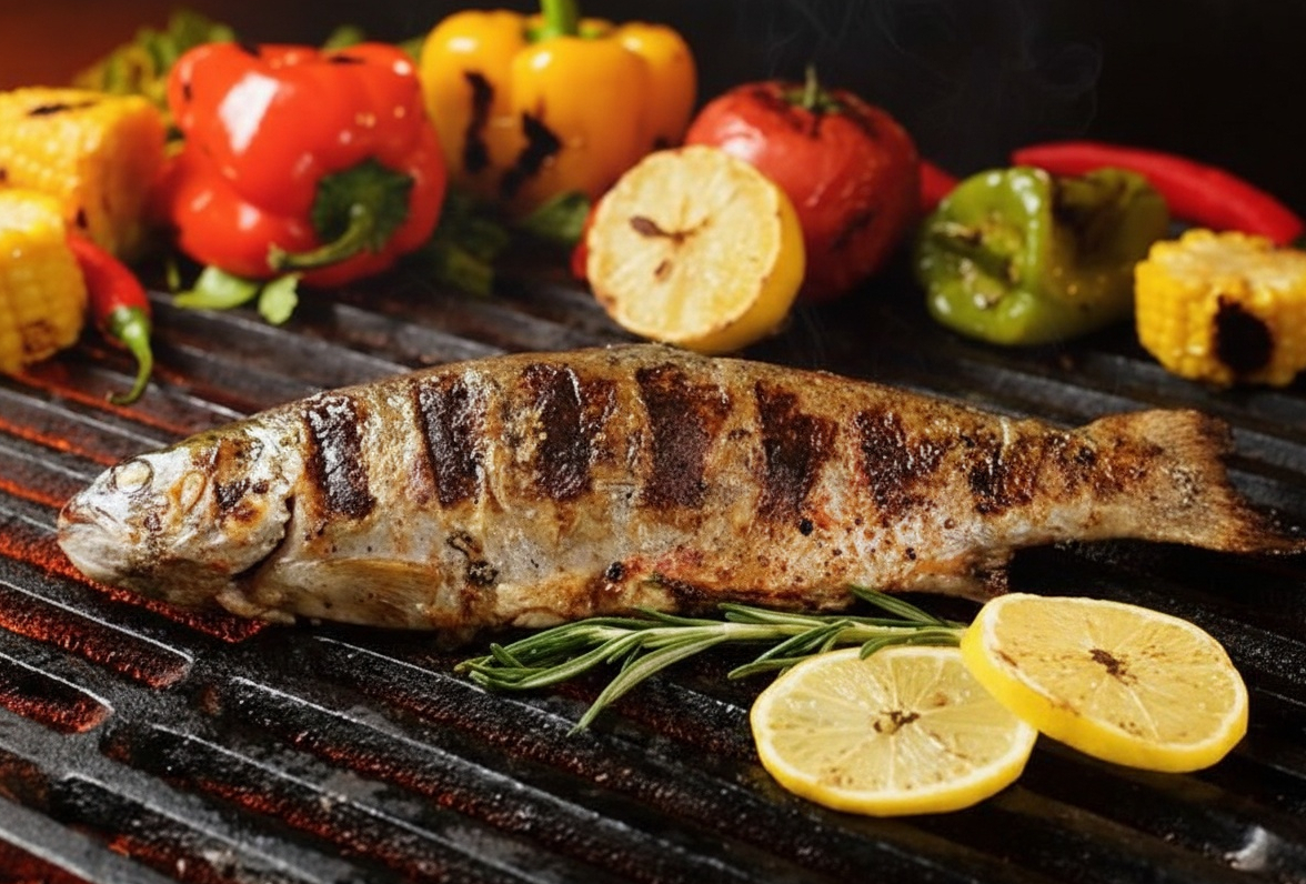 Радужная форель, приготовленная на мангале, представляет собой уникальное сочетание свежести рыбы и аромата древесины. Поверхность рыбки покрыта аппетитной корочкой, сквозь которую просвечиваются мягкие и влажные ткани мяса. Легкая глазурь придаёт ей дополнительный объем и элегантность, оставляя впечатление изысканного блюда.