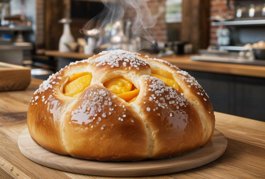Вашему вниманию представлена свежая булочка с сочной начинкой из спелого персика. Традиционное исполнение булочки включает нежное тесто, поверх которого расположен слой очищенных кусочков персика, обработанных особым способом для максимального сохранения витаминов и минералов. После выпечки булочка обретает насыщенный жёлтый оттенок, становясь похожей на солнце и грея сердца и желудки покупателей.