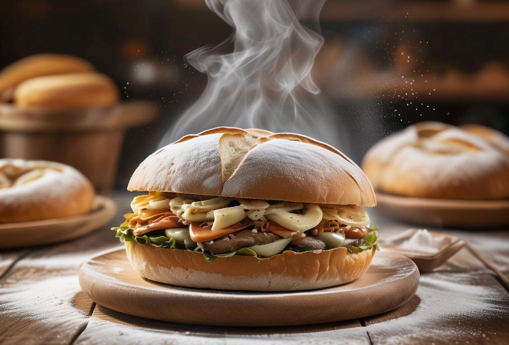 Приготовленный по особому рецепту, сэндвич завораживает своим внешним видом и привлекательным ароматом. Две свежие булочки нежно держат между собой разнообразные ингредиенты: овощи, мясо, сыры и специи, создавая гармонию вкуса и аромата. Продукт только вышел из печи, а потому сохранён весь первоначальный вкус и свежесть ингредиентов. На поверхности сэндвича заметно появление легкого облака пара, подтверждающего его свежесть и высокое качество изготовления. Изображение позволит покупателям представить себя в атмосфере кафе или ресторана, наслаждаясь изысканным вкусом и ароматом этого кулинарного произведения.