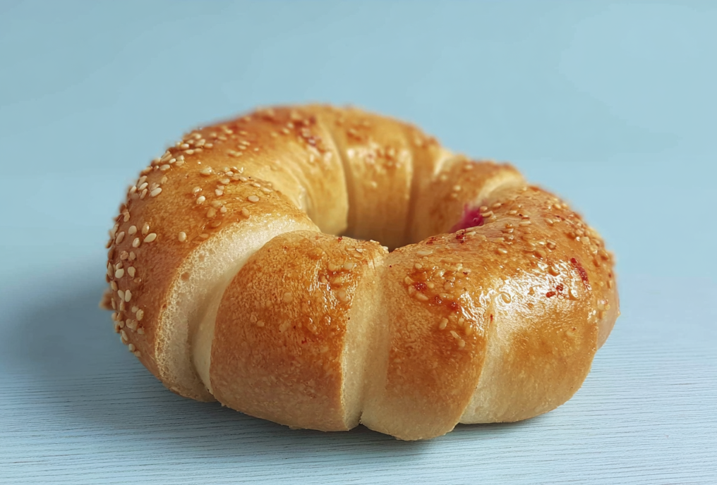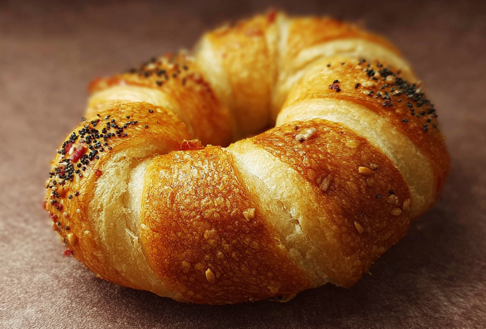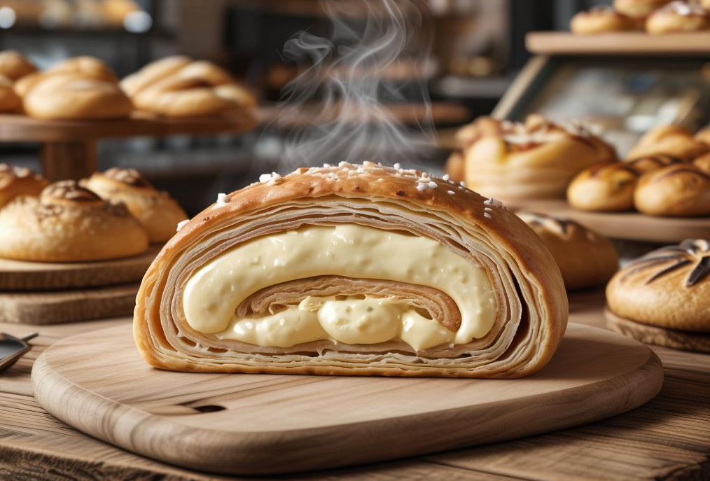 Этот рогалик — настоящее лакомство для любителей сладкого. Внутри него скрывается нежный творожный крем, который придает изделию сладость и кремовую текстуру. Тесто рогалика хрустящее снаружи и мягкое внутри, а начинка добавляет сладости и свежести. Пар, поднимающийся вверх, подчеркивает свежесть выпечки и вызывает желание попробовать этот десерт. Рогалик с творожным кремом — идеальный выбор для тех, кто любит сочетать сладкое и полезное.