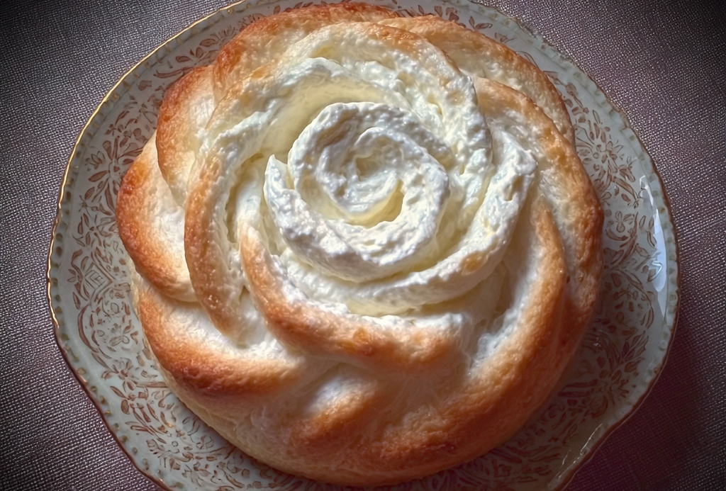 Этот кулинарный шедевр представляет собой нежное тесто, скрученное в форме розы, с аппетитной творожной начинкой внутри. Творог придает изделию легкую кислинку и насыщенный вкус, а золотистая корочка манит своим ароматом. Пар, поднимающийся вверх, подчеркивает свежесть выпечки и вызывает желание попробовать этот десерт. Розанчик с творогом — идеальное сочетание вкуса и красоты, которое украсит любой стол и подарит наслаждение каждому, кто его попробует.