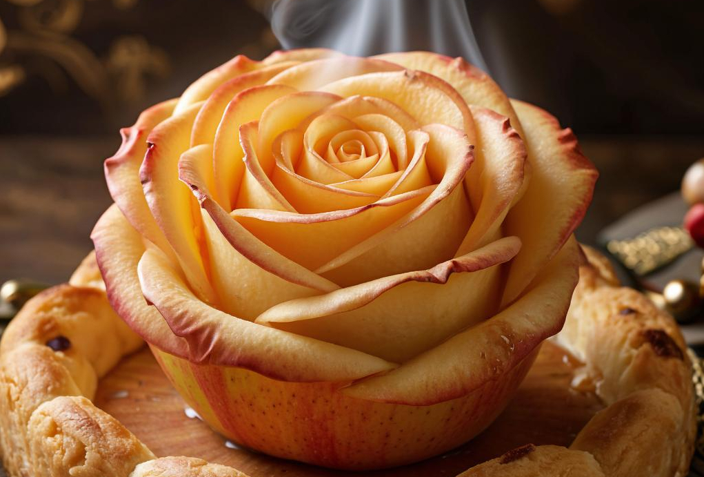 Попробуйте новое кулинарное произведение — яблочную розочку, которая удивит вас своим оригинальным дизайном и невероятным вкусом. Искусно сформированная, эта выпечка представляет собой миниатюрную копию розы, с нежным ароматом яблок и сладких специй. Яблоки нарезаны тонкими пластинами и расположены в форму лепестков, формируя красивый цветок. Поверхность блестит от небольшого количества карамелизированного сахара, который подчеркивает сладость яблока и улучшает визуальные характеристики продукта. Свежий пар, поднимающийся вверх, демонстрирует свежесть и качество выпечки. Сочетайте нашу яблочную розочку с любимым напитком и создайте атмосферу уютного домашнего вечера.