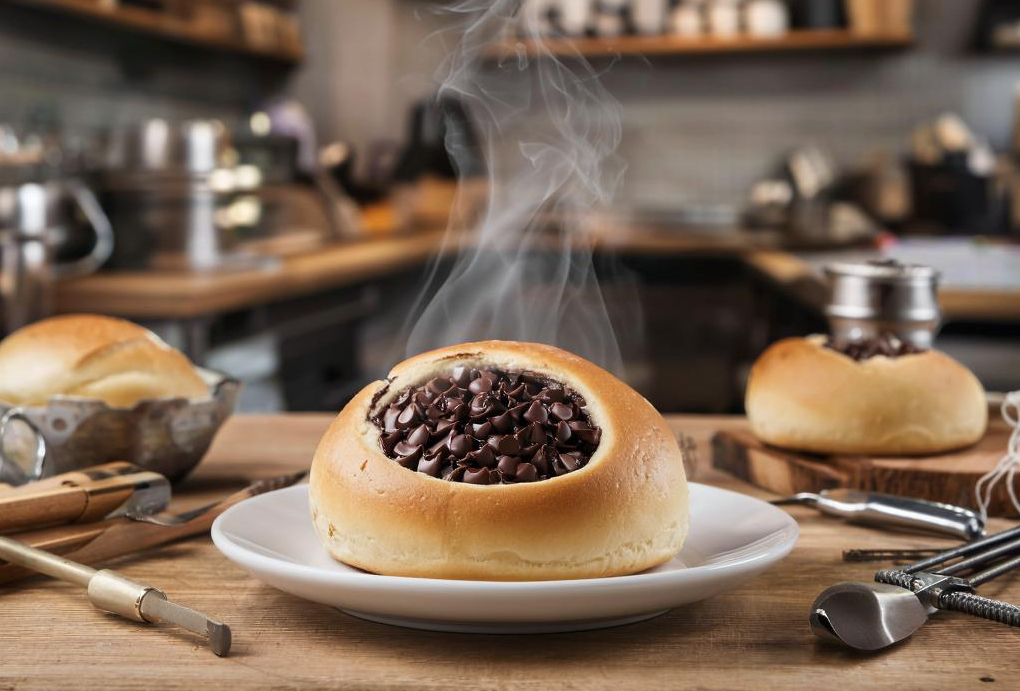 Откройте для себя прелести настоящего кондитерского искусства с нашей свежей булочкой, наполненной богатой шоколадной начинкой. Кусочки качественного тёмного шоколада гармонично распределены среди воздушных слоев нежного теста, придавая изделию необычный оттенок и богатство вкуса. Булочка выходит из духовки горячей, пар поднимается от поверхности, раскрывая характерный аромат выпечки и шоколада одновременно.