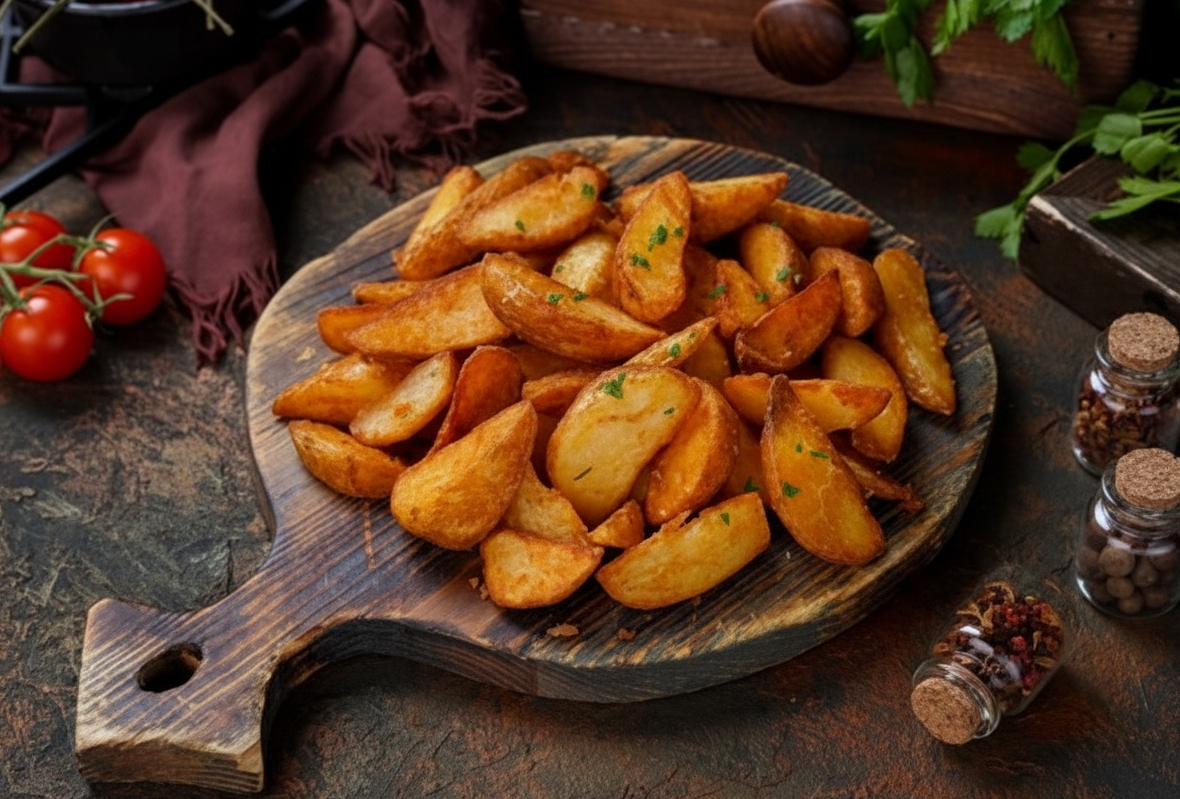 Картофель по-домашнему, известный также как картофель по-деревенски, представляет собой простой и вкусный способ приготовления картофеля. Нарезанный крупными ломтиками картофель запекается в духовке до образования золотистой корочки, сохраняя при этом внутреннюю сочность и мягкость. Обычно блюдо приправлено солью, свежемолотым чёрным перцем и травами, такими как розмарин или тимьян, что усиливает аромат и подчеркивает природный вкус картофеля. Некоторые рецепты включают использование чеснока или масла, чтобы придать дополнительные оттенки вкуса. Получившийся картофель выглядит аппетитно и обладает приятной хрустящей поверхностью, оставаясь мягким внутри. Это отличный выбор для семейных обедов или простых вечеров в кругу семьи.