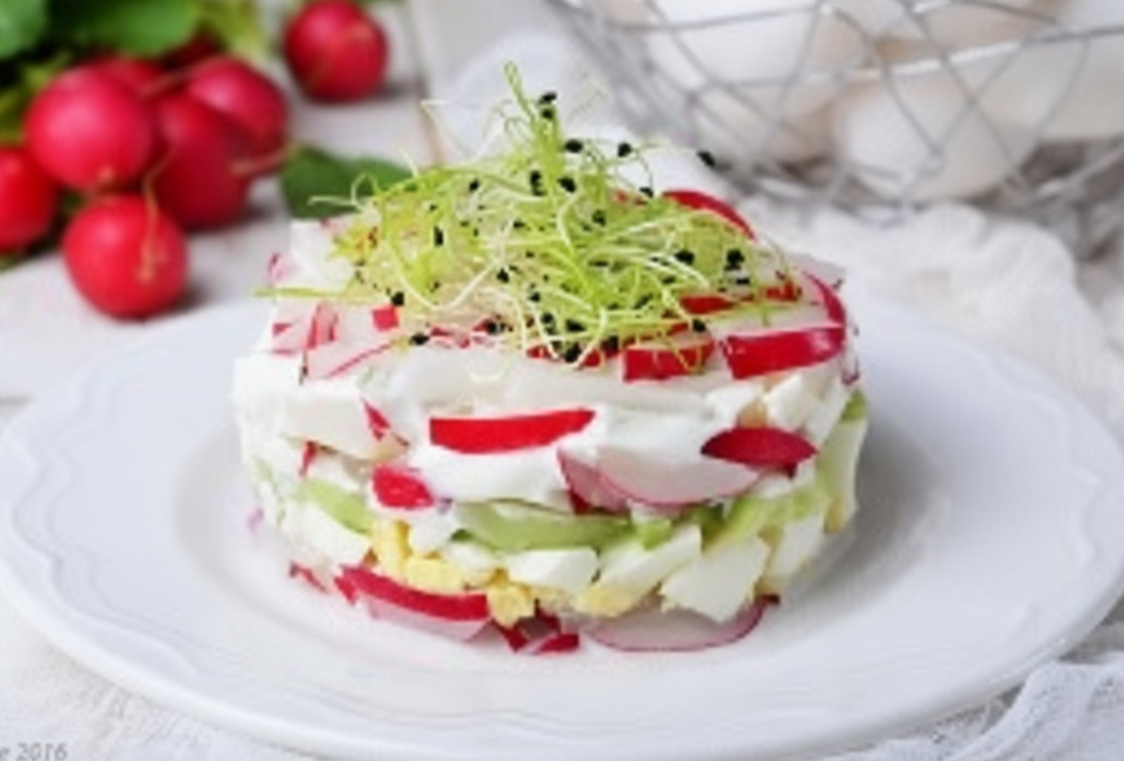 Свежесть и легкость — вот главные характеристики этого салата. Яркие цвета овощей создают настроение весны, а сочетание ингредиентов придает блюду особую гармонию вкуса. Идеально подойдет как закуска на праздничном столе или легкий обед.