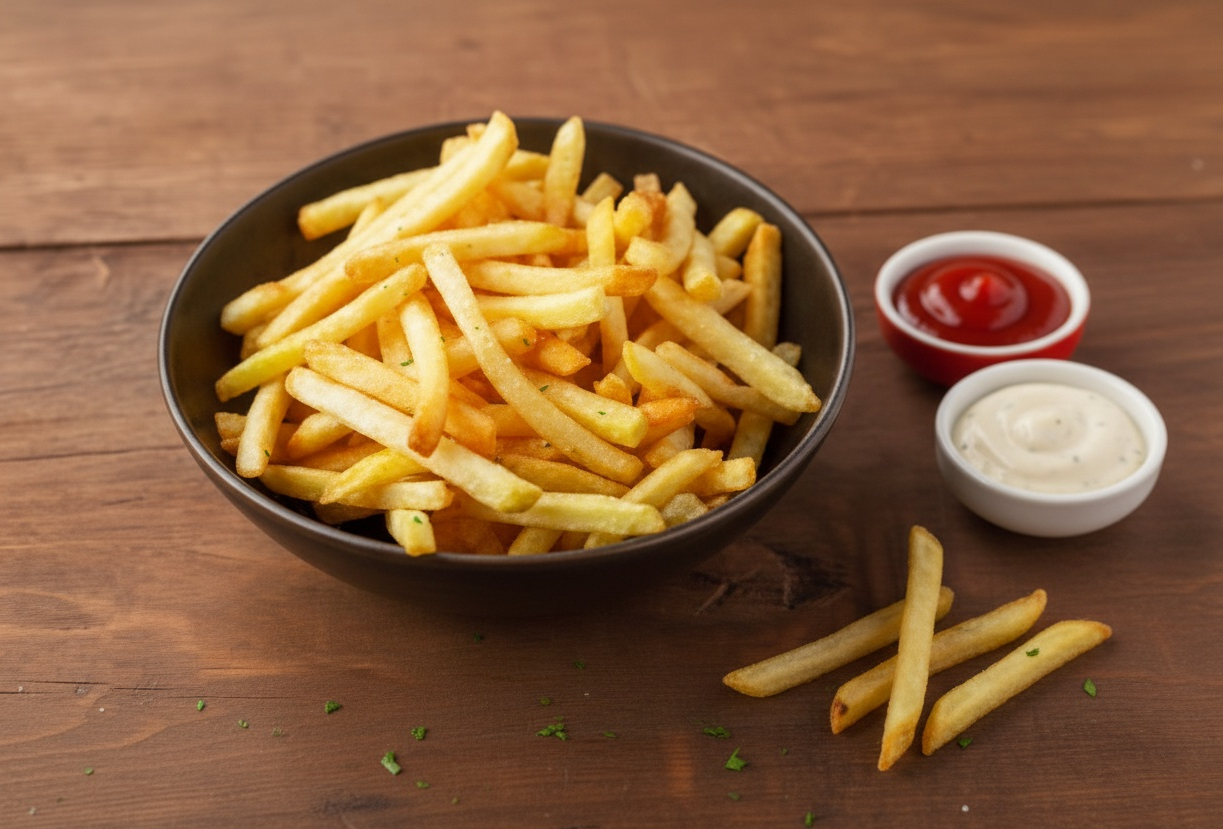 Картофель фри — это знаменитое блюдо, любимое миллионами людей по всему миру. Тоненькие соломки картофеля обжариваются в кипящем масле до появления золотистого оттенка и хрустящей корочки. Внутренняя структура картофеля остаётся мягкой и влажной, что делает каждую палочку особенно привлекательной. Фритюр придаёт картофелю насыщенный вкус и замечательный аромат. Картофель фри традиционно подается с различными соусами, такими как кетчуп, майонез или чесночный соус, что позволяет экспериментировать с вкусами. Это универсальное блюдо способно украсить любую трапезу, от быстрого перекуса до вечеринки с друзьями.